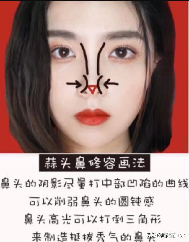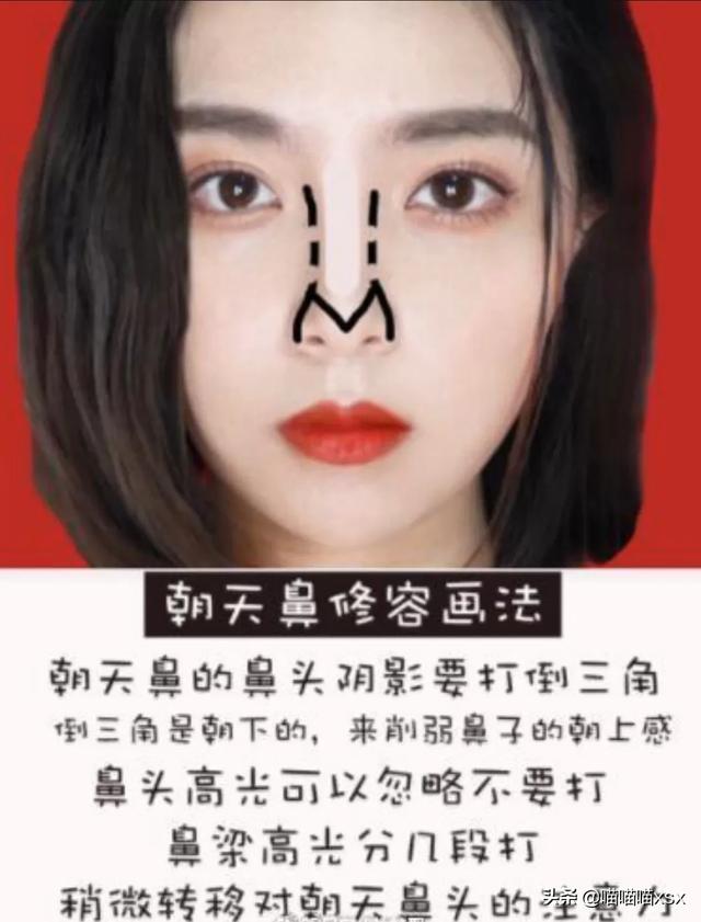- 鼻孔明显:有小猪鼻的女生也不必自卑,在修容方面施点小心机就可以隐恶扬善~沿着眉头至鼻头两侧扫上连续不断的阴影,并在鼻梁中央打亮,把视觉重点集中在鼻梁上而忽略鼻头处。