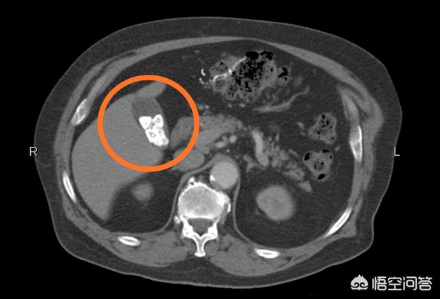 上图是一位胆囊结石患者的腹部CT图像,可以看到胆囊内(画圈)多发大小不等的高密度结石影。