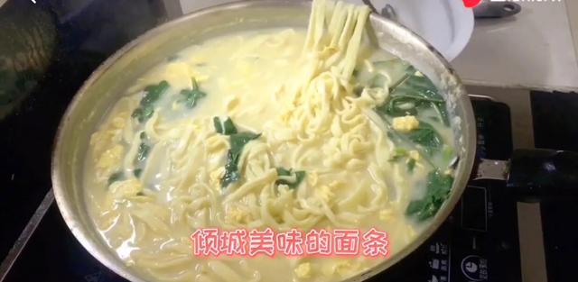 第五步、锅中水开后,放入擀好的面条,烧至沸腾时加入炒好的鸡蛋,放一把时蔬,这时最好是放上一些胡椒粉,不喜可以不放,(胡椒去寒增热)面条煮熟后起锅盛入碗中,热呼呼的面条完成!