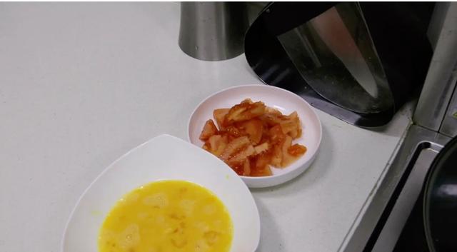 第四步、锅中放入适量油,油热把鸡蛋液放入锅中炒成凝固装盘备用。再放油把西红柿炒出汁加入清水烧开。
