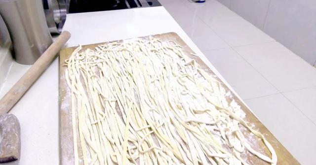 第三步、面醒好后,再次揉搓上劲,然后擀成大块,切成面条备用!