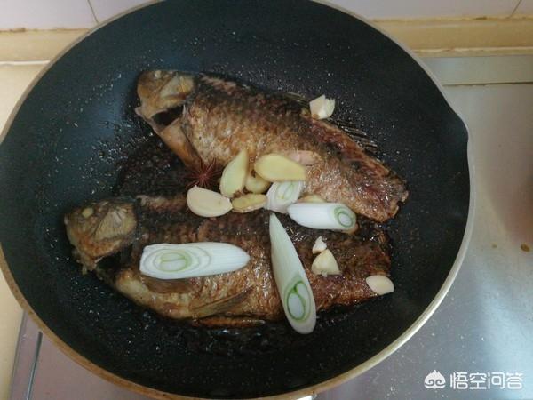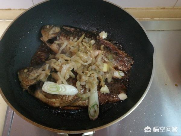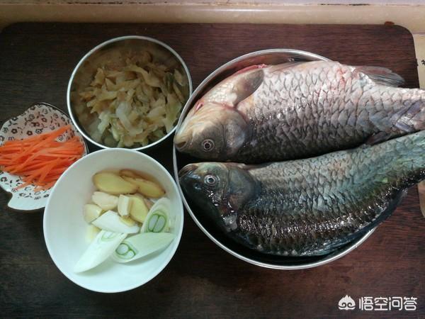 新鲜鲫鱼去鳞、去鳃、去内脏,胡萝卜切丝,葱切段,姜切片,大蒜拍扁后切两刀