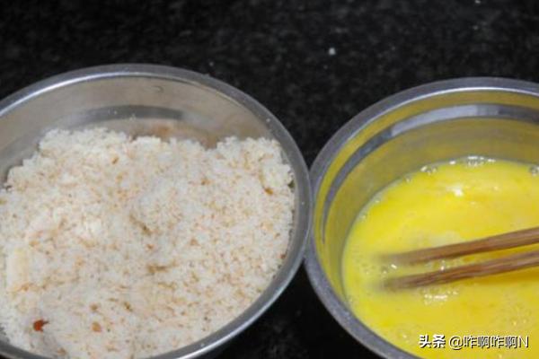 5、鸡蛋打入碗里,稍微放点盐,将面包糠准备好。
