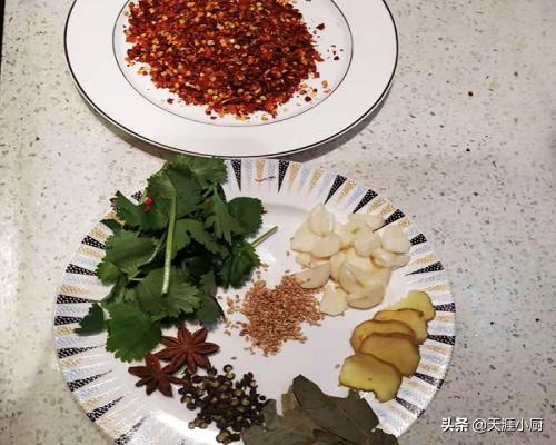 - 大蒜5瓣 香葱4棵 草果2个 桂皮1小段 八角1个 香叶3片 花椒15粒 麻椒10粒 丁香5粒 花生油500毫升