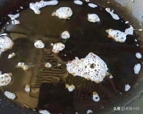 提示:炸调料的时候要把燃气灶调到小火,利用低温将调料炸干的时候调料中的味道也就进入到热油当中,这个时候要用笊篱将调料从油锅当中捞出来,留下锅中的油。