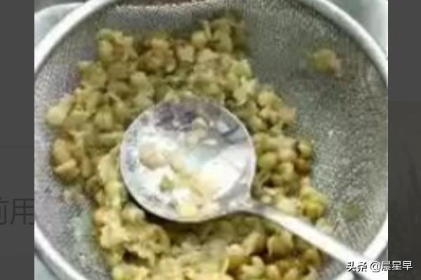 3、 然后可以讲煮掉的绿豆皮捞出,如果还有没有煮掉的绿豆皮则可以等绿豆稍微凉一下用手搓掉,然后将去掉皮的绿豆用纱网过成绿豆沙,越细越好(可以留一些刚煮出来的绿豆)。