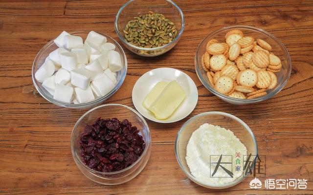 棉花糖160g 黄油35g 奶粉50g 瓜子仁50g 蔓越莓干50g 饼干150g。