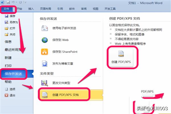 调整好图片之后,我们就开始转换了,点击word的功能选项的文件——》保存并发送——》创建PDF/XPS文档——》创建PDF/XPS,如图。
