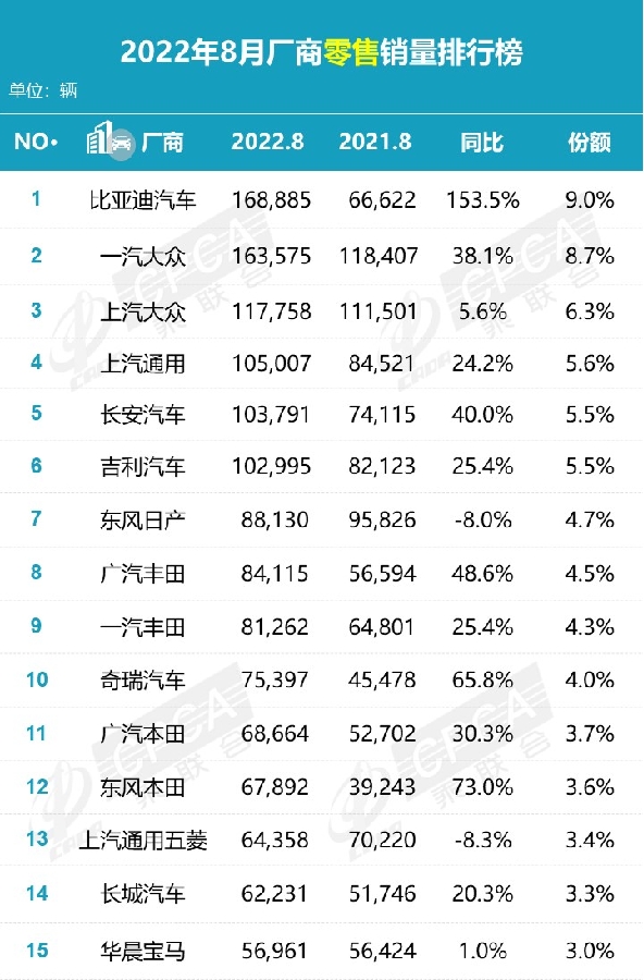 在8月份汽车厂商销量排名中,比亚迪再次蝉联销冠,以168885辆的成绩夺得8月份的销量冠军,且实现了同比153.5%的大幅增长。总体来看,在乘联会厂家销量排行TOP15中,大多数车企的同比增幅都在20%以上。至于各细分市场的表现又如何呢?