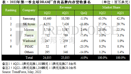 据了解,2022 年第一季度全球 DRAM 自有品牌内存营收排名前五位分别为三星(Samsung)、SK 海力士(SK Hynix)、美光(Micron)、南亚科(Nanya)、华邦(Winbond)。