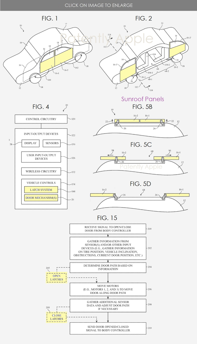 苹果的专利图5B-5D为示例车辆的部分俯视图,显示了天窗板或车门如何滑动和/或展开以进行打开和关闭;图15是使用自适应定位打开和关闭车门的说明性步骤的流程图。