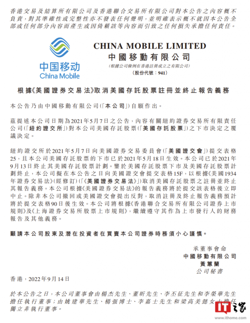 9 月 14 日消息,今日下午,中国移动发布《关于取消美国存托股票注册并终止报告义务的公告》称,纽约证交所已于 2021 年 5 月 7 日向美国证券交易委员会提交表格 25,公司美国存托股票的下市已于 2021 年 5 月 18 日生效。