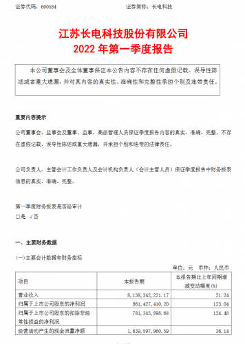 长电科技2022年第一季度实现净利润8.6亿元同比增长123%
