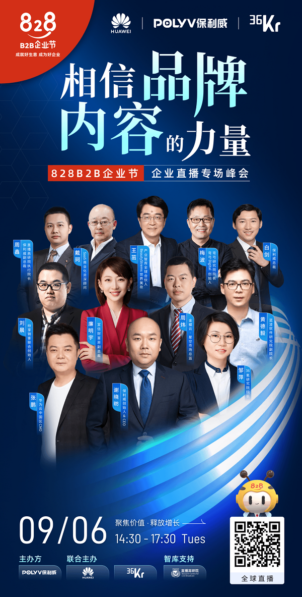 9月6日,由保利威携手华为云、36氪举办的828 B2B企业节 · 企业直播专场峰会在保利威MR直播打造出来的“未来城市”中顺利举办。围绕【相信品牌×内容的力量】主题,12位行业专家造就7场主旨分享,1场超级圆桌,为行业拨开VUCA时代的迷雾,助力企业创新发展!