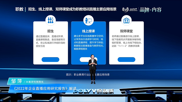 她指出,当下,企业直播的价值已在金融、政企、医疗、职教等场景业务中得到释放——在全链路直播服务的驱动下,企业私域得到高品质增长。