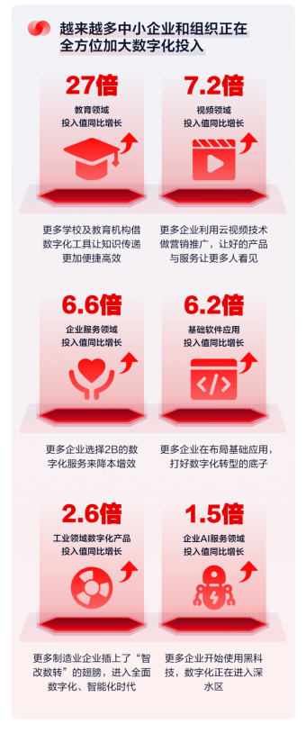与此同时,B2B企业服务投入值同比增长6。6倍,基础软件应用则增长6。2倍,可以看到,越来越多的中小企业正在搭建数字化的基础设施,利用数字化服务工具来降本增效。
