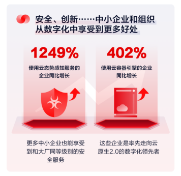 此外,越来越多的企业正在使用数字化工具来支持创新业务,如使用云容器引擎的企业同比增长402%,成为走向云原生2。0的数字化领先者。