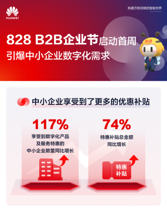 华为云云商店统计数据显示,828 B2B企业节启动首周,购买华为及生态伙伴产品的企业数量相比去年同期增长了117%,与此同时,它们享受到的优惠补贴总额同比去年增长74%。更多企业正在以更低成本解决数字化难题。