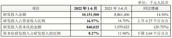 其中,中兴通讯2022年上半年研发投入金额较上年同期增长,主要是由于持续进行5G相关产品、芯片、服务器及存储、创新业务等技术领域的投入所致。研发投入金额占营业收入比例为16.97%,较上年同期的16.70%上升0.27个百分点。