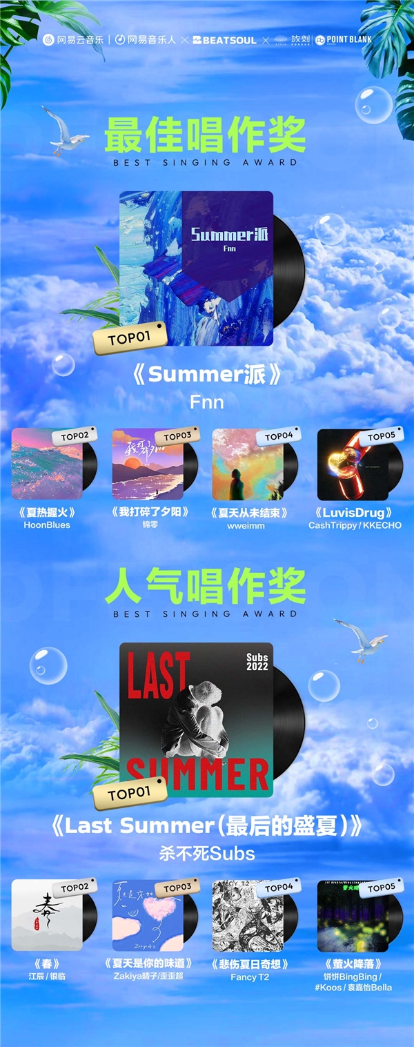 新晋歌手Fnn联合Jax制作夏日派对舞池歌曲《Summer派》,成为本次赛事的最强黑马,获得最佳唱作奖第一名。新世代情绪说唱歌手杀不死Subs联手老搭档No Birthday,投稿歌曲《Last Summer(最后的盛夏)》,斩获人气唱作奖第一名。