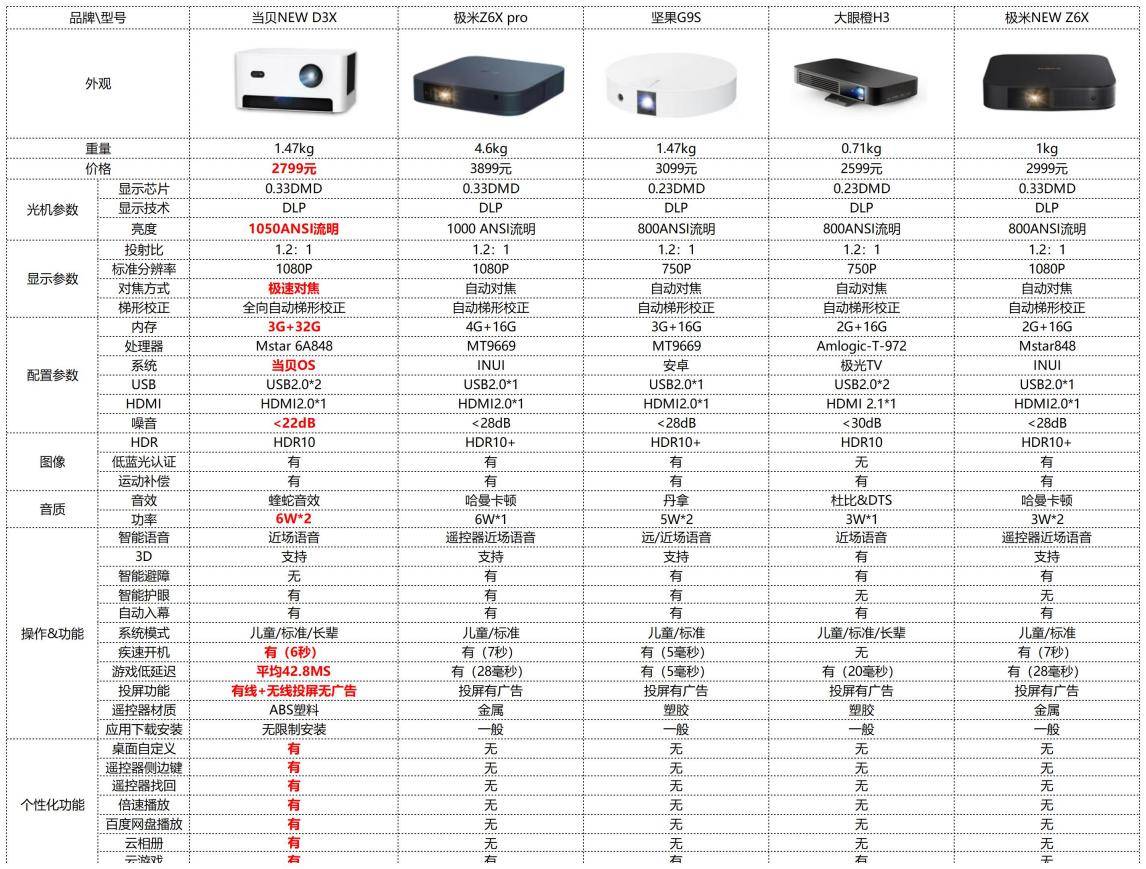 我们先来看一下当贝NEW D3X和同价位产品之间的参数对比!