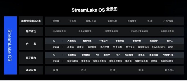 于冰表示,基于快手深厚的底层技术积累和沉淀,StreamLake形成了编解码算法、传输算法、AI特效、知识图谱等丰富的原子能力,以及行业领先的下一代产品矩阵,点播云、直播云、媒体处理与存储、虚拟人、内容审核、特效美化、内容理解、互动与创作、快手云剪、快手极目、音视频SDK、SoundMatrix智能会议音箱、6DoF自由视角视频等产品,辅以专业技术咨询服务,为行业客户提供场景化的解决方案。