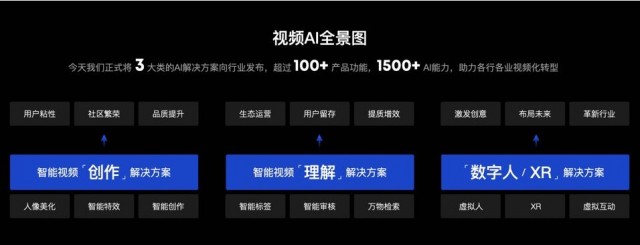 在智能视频创作解决方案中,包含了内容创作环节的人像美化、智能特效、图集成片、文案成片等能力;智能视频理解解决方案,依托快手多年沉淀的多模态技术,实现海量视频的结构化管理,像管理图书一样管理短视频,应用于内容生态分析、基于兴趣的个性化推荐、智能审核、原创保护等方向。