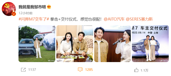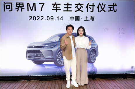 9月14日,问界M7车主交付活动在上海隆重举行,奥运冠军“中国拳王”邹市明和妻子冉莹颖也出现在本次交车仪式现场,以问界M7新车主的身份喜提爱车。
