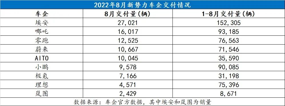 实际上,9月第一天,几家头部新势力造车纷纷公布了8月的交付数据,除理想、小鹏碍于新老车型切换等原因出现环比下滑,其它家的表现都足以称得上一片大好,纷纷创下了历史新高。