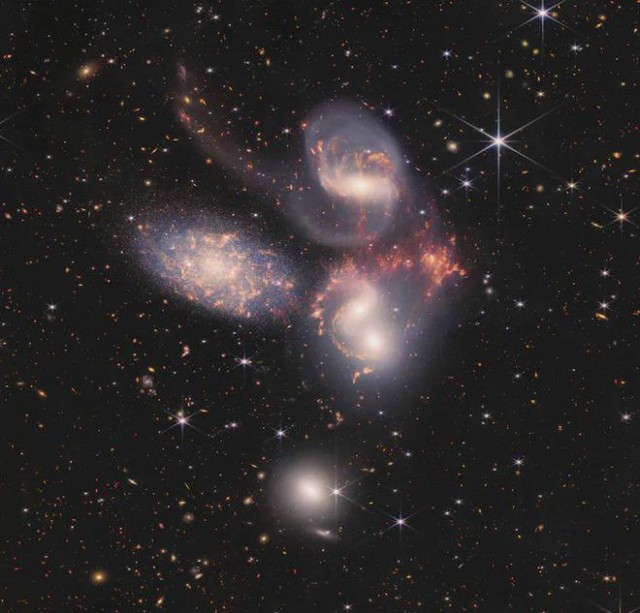 据悉,韦伯望远镜搭载的中红外探测仪可以看到肉眼不可见的光波,有助于观察新生恒星等天体的细节特征。两个月来,韦伯望远镜发回了一系列令人惊叹的深空图像,其中离不开中红外探测仪的功劳,比如望远镜拍摄著名的“斯蒂芬五重奏”星系团照片就使用了中红外探测仪。
