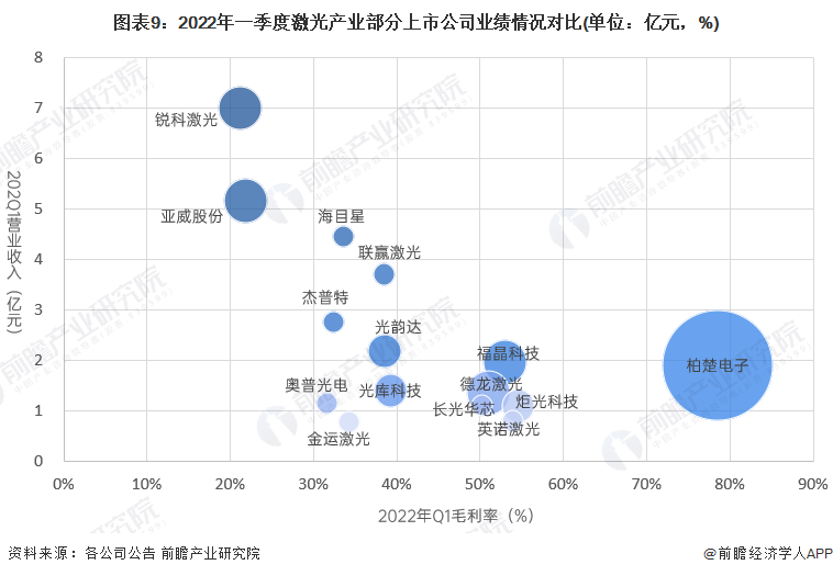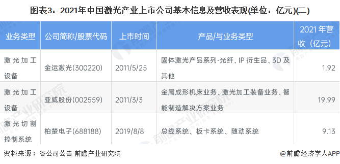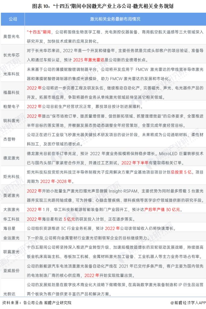激光产业相关上市公司较多,激光元器件企业具备较好的竞争优势,那些原本从事激光器生产和销售的企业正在往下游激光加工设备和激光应用解决方案领域拓展。