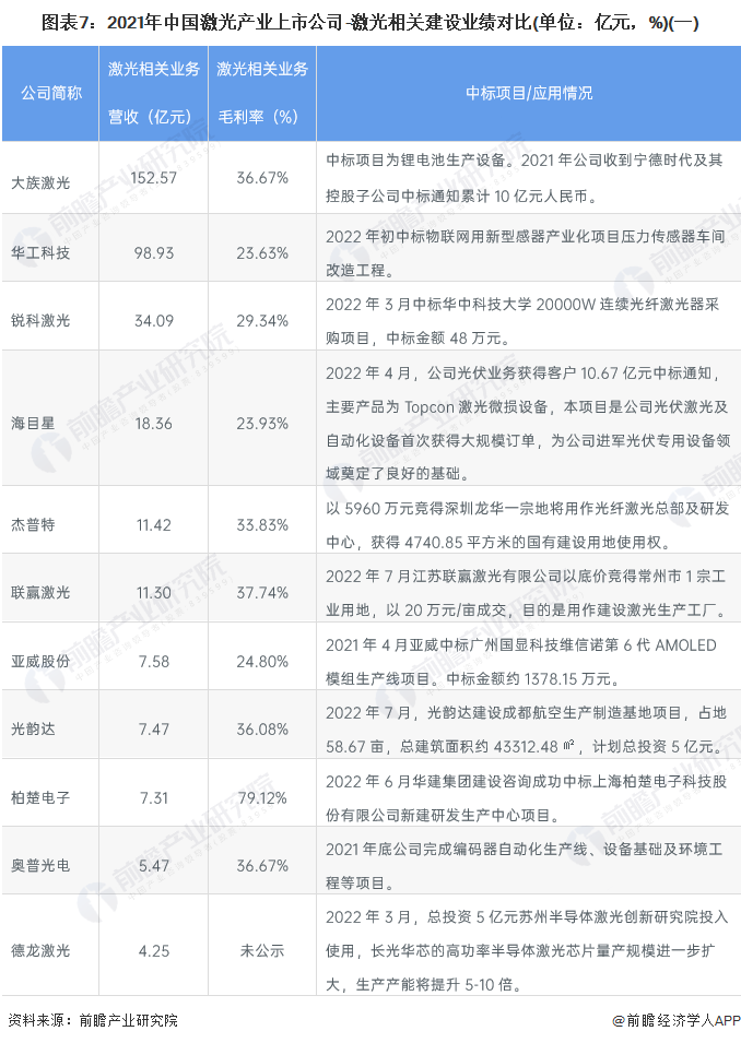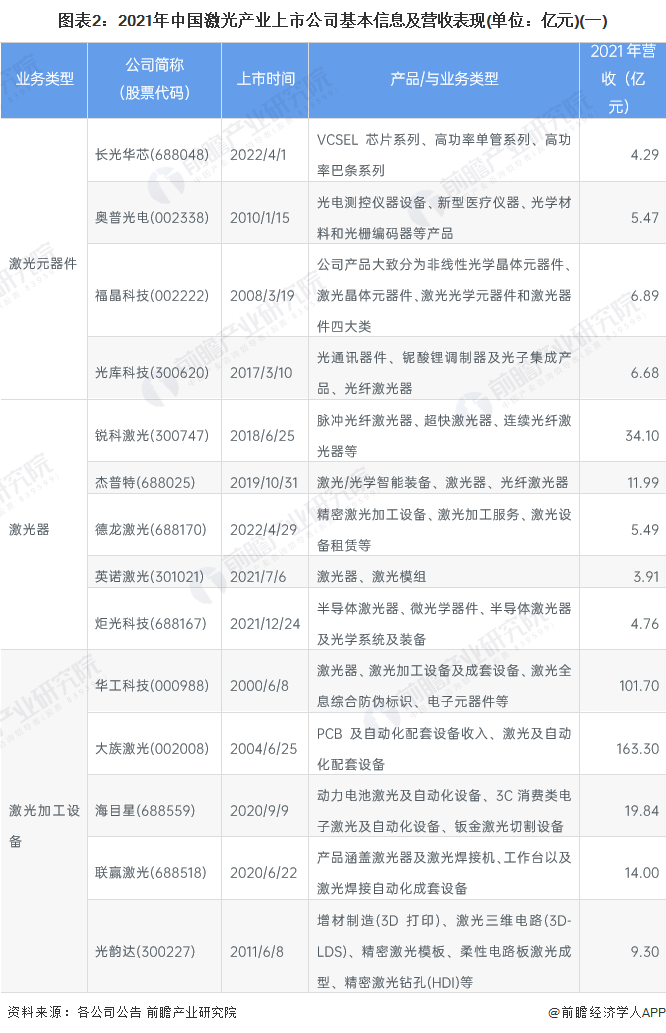 激光元器件企业有福晶科技(002222)、长光华芯(688048)、光库科技(300620)、奥普光电(002338);激光器企业有锐科激光(300747)、炬光科技(688167)、杰普特(688025)、德龙激光(688170)、英诺激光(301021);激光加工设备企业有大族激光(002008)、华工科技(000988)、海目星(688559)、联赢激光(688518)、亚威股份(002559)、金运激光(300220)、光韵达(300227);激光切割控制系统企业有柏楚电子(688188)等。