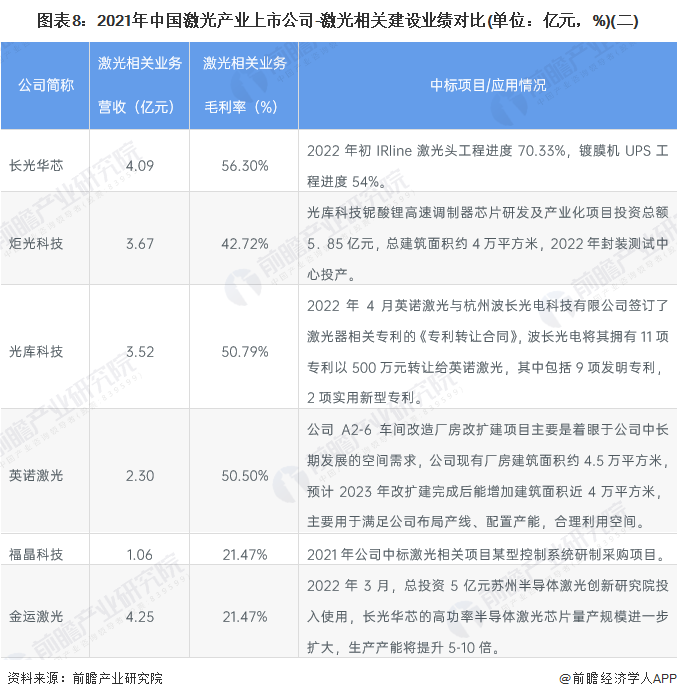 目前,在激光相关业务中收入最高的是行业龙头大族激光,2021年高达152.57亿元,毛利率为36.67%;其次华工激光2021年营收接近百亿,达98.93亿元,毛利率23.63%;海目星、杰普特、联赢激光的激光业务突破十亿元大关,毛利率也在23%-38%之间。其他公司激光营收低于10亿元,但英诺激光、光库科技、长光华芯的毛利率超过50%。