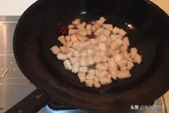 2、锅中加底油,肥肉多的话可以少放油;油5成热即可加入大料和肥肉;中小火慢慢将肥肉中的油脂煸出,这时肥肉微微变色和收缩。
