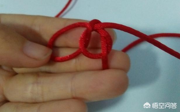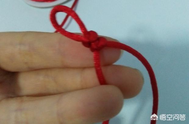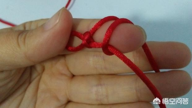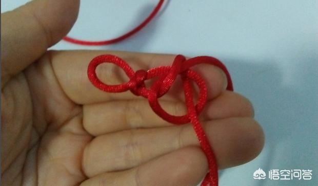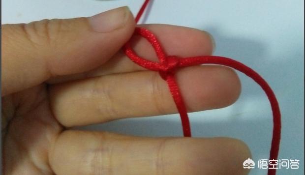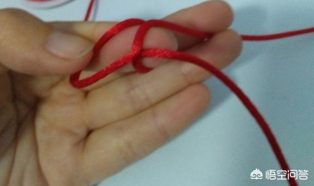 要把红线对折用拇指捏住放在食指上,把上边的线绕食指一圈,如下图