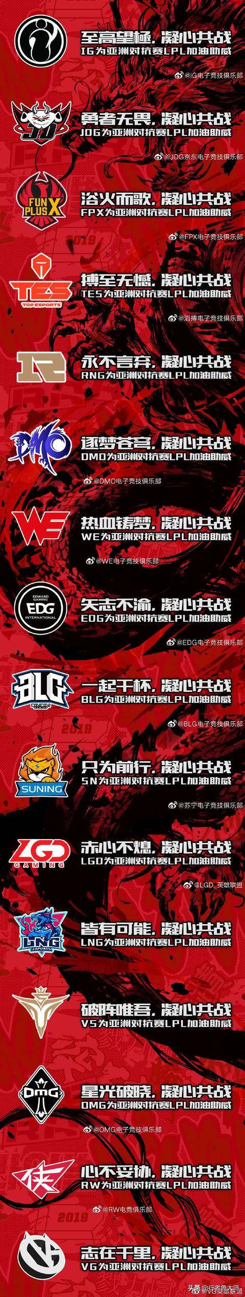 今天,LPL的16支队伍都在各自官微上发布了一条洲际赛加油海报,海报上除了各支战队的主题口号外,均在后面附加了一句凝心共战,也表明各支队伍要团结一心,共同努力争取为LPL赢得冠军。