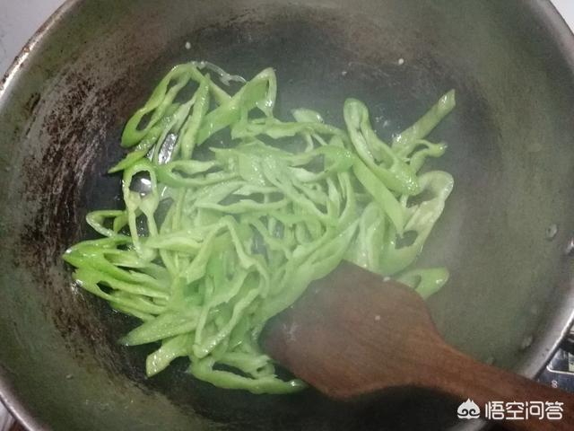 2、锅内倒少许油,放入青椒翻炒,至青椒变软,炒出香辣味盛出。