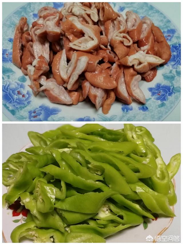 1、肥肠斜切小块,青椒切块。
