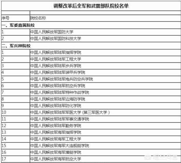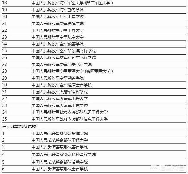 我国共有军校43所,其中有2所是军委直属院校,35所是军兵种院校,还有6所武警院校。具体名单如下: