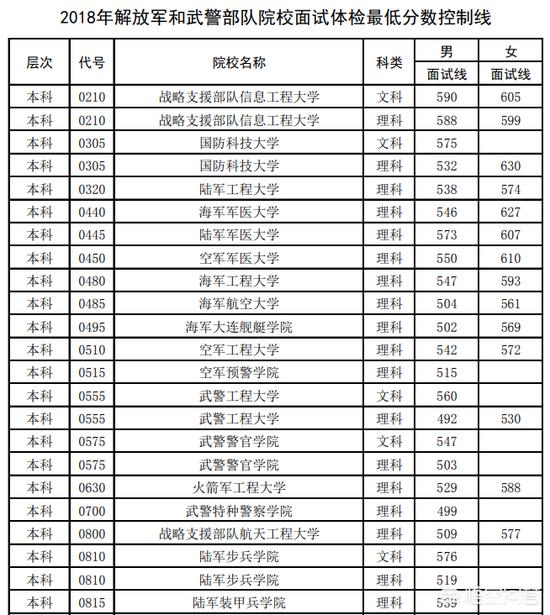 体检分数线最高的是陆军勤务学院(文科)594分,战略支援部队信息工程大学(文科)590分。2018年河南理科一本线499分,文科547分,从表中可以看出,一本科线附近的就是武警工程学院理科492分。如果是本科线,就是二本线的分数,上军校的可能性不大。