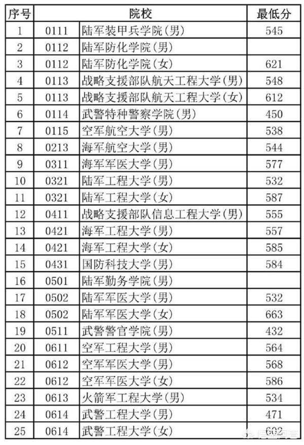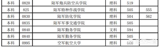 其次是35所军兵种院校。这些军校在不同的省份,录取分数线是不同的,甚至差别很大。即使同一省份,因为兵种不同,录取分数线也不相同。
