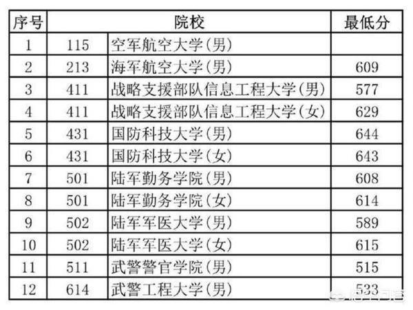 从表中可以看出,中央军委直属院校有两所,国防大学和国防科技大学。这两所军校,国防大学不招本科生,国防科技大学的录取分数一般都在600分以上,甚至高达六百四五。