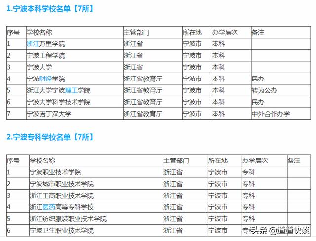 宁波位于东海之滨、长江三角洲的南翼,毗邻上海、杭州,是浙江省第二大城市。宁波是中国著名的历史文化名城,著名的爱情悲剧——梁祝故事的发源地,还是中国著名的院士之乡,截止到2017年底,宁波籍两院院士的总数就达115位。但是宁波的大学数量和质量并不太多太高,它共有14所高校,其中本科7所,专科7所,具体名单请参看下面的截图。