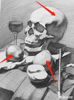 最后调整收尾时,亮部的色调最亮,所以用HB画每个静物的亮部,或者静物的高光