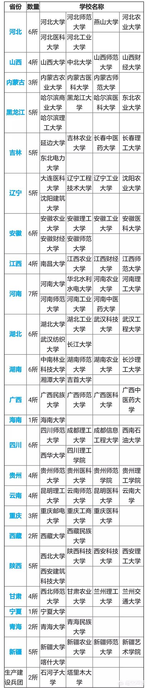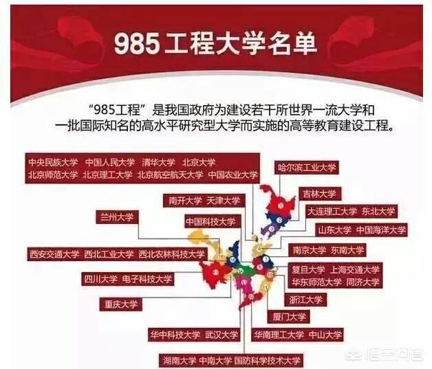 “985工程”,1998年5月,国家政府提出,为建设若干所世界先进的一流大学和一批国际知名的高水平研究型大学而实施的重大教育工程。“985工程”大学一定是211大学,211大学不一定是985大学,“985工程”大学(39所)分布如下: