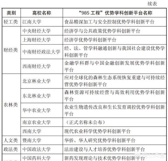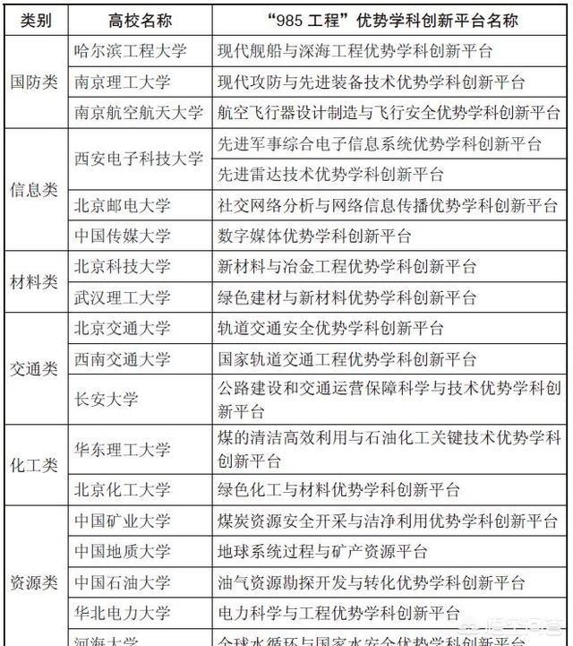 “985工程优势学科创新平台”简称“985平台”“小985”,这些高校具有顶尖的优势学科,档次介于“985”高校和一般的“211”高校之间,只有中央部委直属的“211工程”大学才有资格获得;区别是“985工程”侧重建设顶尖综合类大学,“985平台”侧重建设顶尖的行业特色大学。(33所)详细名单如下:
