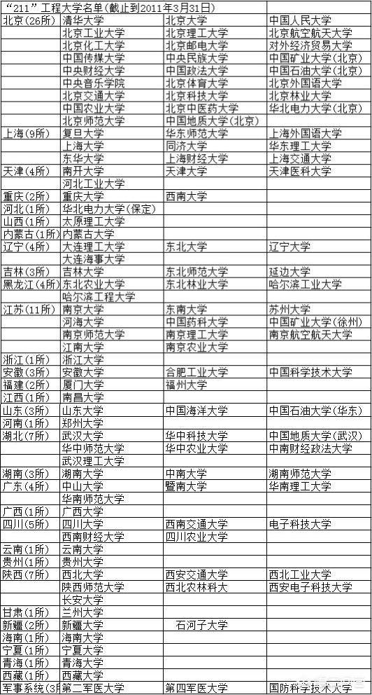 “211工程”,1995年11月正式启动,即面向21世纪、重点建设100所左右的高等学校和一批重点学科的建设工程。“211工程”大学(116所)名单如下: