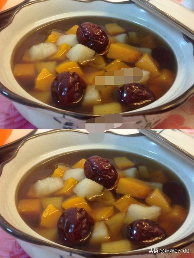 鲜山药、南瓜洗净切块;红枣去枣核;材料放入煲内加水烧开,改用小火炖1小时左右,至山药、南瓜熟烂时即可。