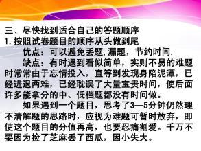 高三刚开始做理综试卷时,先做选择题,然后做化学和生物,将物理留在最后,结果物理总是50分左右,后来改成先做物理,再做化学将生物留在最后,物理每次都能上80分,理综成绩也就得到大幅度的提高,所以说答题顺序很重要,有很强的灵活性。