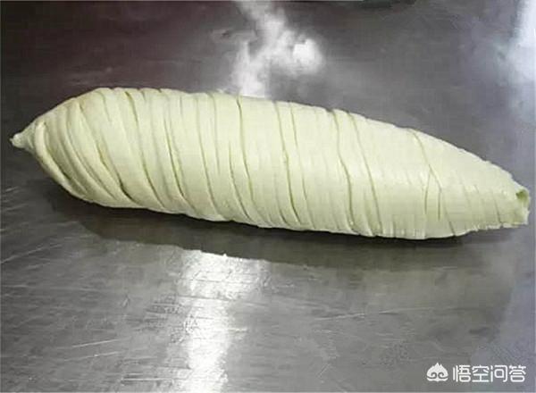 4.然后在面皮上刷一层油,从一头卷起(卷制时,一边抻拽,一边卷形成中间粗,两头细的纺棰形面筒即可)。尾部留一部分的面皮,用划条器均匀地划成细丝。